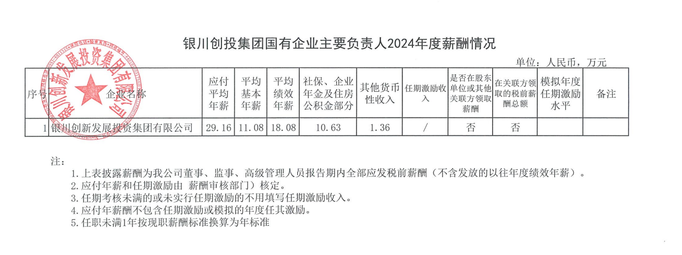 銀川創(chuàng)投集團(tuán)國(guó)有企業(yè)主要負(fù)責(zé)人2024年度薪酬情況